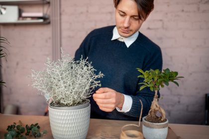 Ghivecele colorate sau suporturile decorative pot adăuga un plus de culoare subtilă.